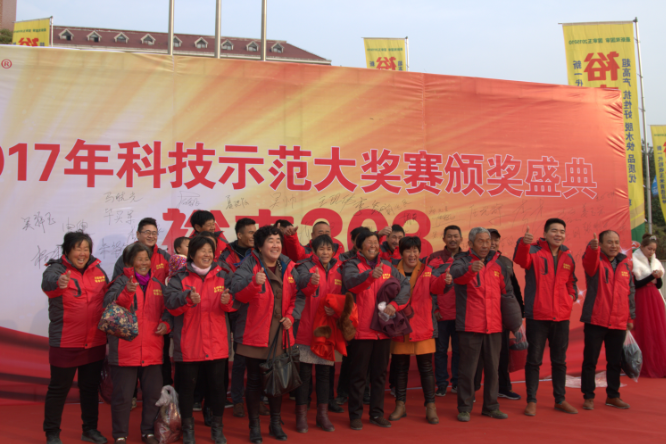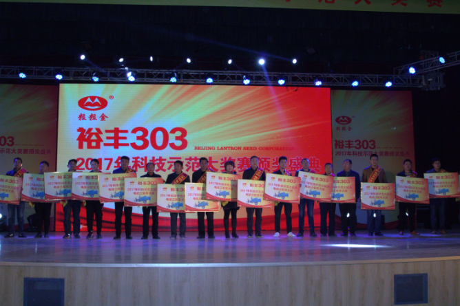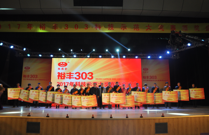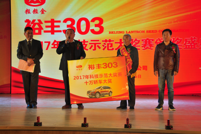現場針對2017年221名裕豐303優秀種植示范戶分別頒發十萬轎車、金磚、電動三輪車獎品,以表彰他們科學種田、示范推廣優良品種裕豐303所作出的突出貢獻。其中一等大獎價值十萬元的轎車被安徽蕭縣酒店鎮胡孝蘭摘得,其中參賽產量為2252.9斤;二等獎價值5000元的金磚分別被河南省西華縣、滑縣、山東省梁山縣、陽信縣、河北省臨漳縣、任丘市、安徽利辛縣、泗縣、江蘇灌云到等20個縣市示范戶獲得,其中山東省平度市張舍鎮石賢勝畝產達2108斤、滕州市張汪鎮張佑代畝產達2025.36斤、河北省灤平縣大屯鄉王國強畝產達2040.28斤;二等獎20名平均畝產達1800以上。